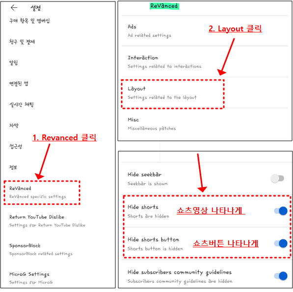 2. 설정에서 아래쪽으로 가면 ReVanced를 클릭 후 메뉴에서 Layout을 클릭합니다. 그럼 많은 메뉴들의 활성화를 선택할 수 있는 버튼들이 나오고 아래쪽에 Hide shorts와 Hide shorts button 이 있습니다.