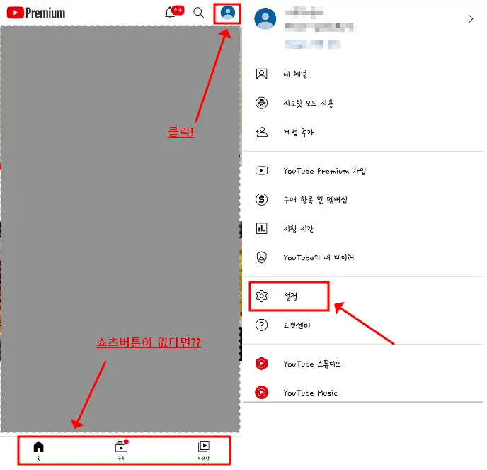 1. 화면 아래 홈, 구독, 보관함만 있는 경우에는 오른쪽 상단에 사람아이콘을 클릭합니다. 그러면 내 계정 정보가 나오고 아래쪽에 '설정' 버튼을 눌러 줍니다.