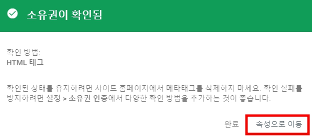 ▶ 다시 구글서치콘솔 화면으로 돌아와 소유권확인의 메타태그를 복사했던 팝업창에서 '확인'을 클릭합니다.