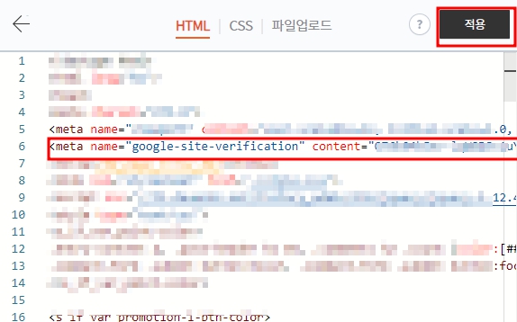 ▶ 1.3.에서 복사한 메타태그(meta name으로 시작하는 코드)를 Ctrl+f 에서 'head'를 찾아 그다음줄에 넣어주시거나 다른 meta name 이 존재한다면 그 아래쪽에 넣어주셔도 됩니다.