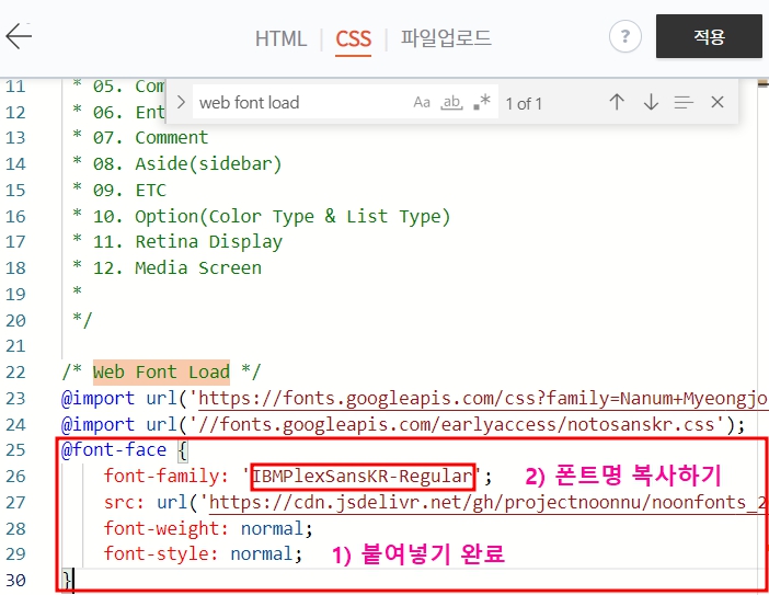 ▶그 아래 'body' 항목의 font-family 옆에 복사한 폰트명을 맨 앞에 붙여넣기합니다.