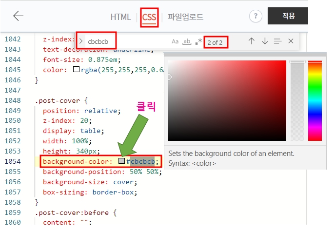 ▶background-color 옆 네모상자를 클릭하면 칼라피커가 나오고, 원하는 색깔을 고르시면 됩니다.