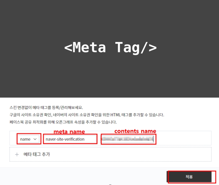 - 1.2. 에서와 같이 네이버웹마스터도구의 사이트 소유확인 화면에서 복사해 두었던 'meta name'과 'content '를 위의 '메타 태그 등록' 화면과 같이 입력해 줍니다.