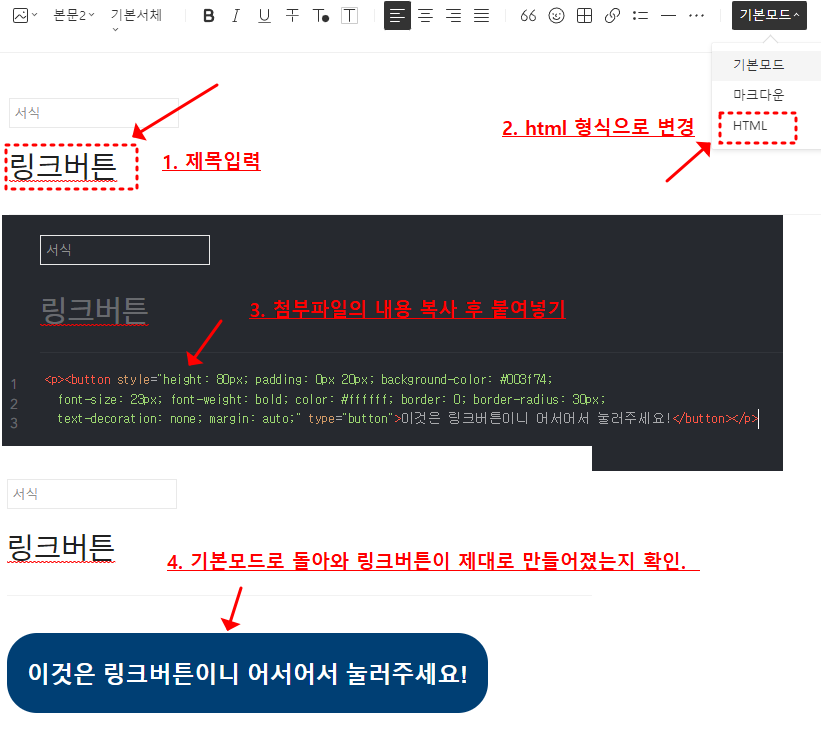 ▶ 제목에 링크버튼이라고 입력해 주고, 오른쪽 상단에 기본모드에서 HTML을 클릭하시면 검은색 화면으로 바뀝니다. 그럼 거기에 위 링크버튼 첨부파일의 내용을 복사하여 검은 배경에 붙여 넣기 해주세요.