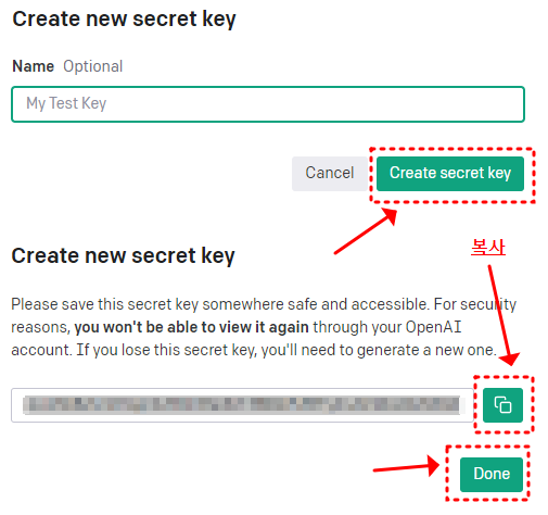 4. 'create secret key' 를 클릭하면 API 키가 생성이 됩니다. 그럼 그 키를 옆에 네모 두개가 겹쳐진 아이콘을 클릭하면 복사가 되는데 다시는 확인할 수 없으므로 어딘가에 꼭 저장해 두시기 바랍니다. 그리고 'Done'을 클릭합니다.