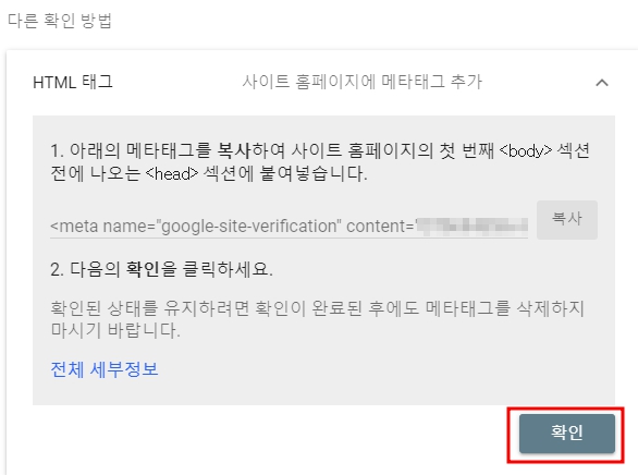 ▶ 다시 구글서치콘솔 화면으로 돌아와 소유권확인의 메타태그를 복사했던 팝업창에서 '확인'을 클릭합니다.