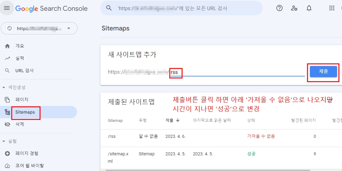 ▶ '새 사이트맵 추가'의 티스토리 주소뒤에 'rss'를 입력 후 제출버튼을 클릭합니다.